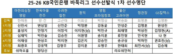 2025-2026 KB±¹¹ÎÀºÇà ¹ÙµÏ¸®±×¿¡ ÃâÀüÇÏ´Â 8°³ ÆÀÀÇ ¼±¼ö ±¸¼ºÀÌ ÃÖÁ¾ È®Á¤µÆ´Ù. 2ÀÏ Çѱ¹±â¿ø¿¡¼­ ¿­¸° 2Â÷ ¼±¼ö ¼±¹ß½Ä¿¡¼­ °¢ ÆÀ °¨µ¶µéÀº 5Áö¸í ¼±¼ö Áö¸í°ú ÇÔ²² ¿Ü±¹ÀÎ ¼±¼ö ¿µÀÔ °á°ú¸¦ ¹ßÇ¥Çß´Ù.