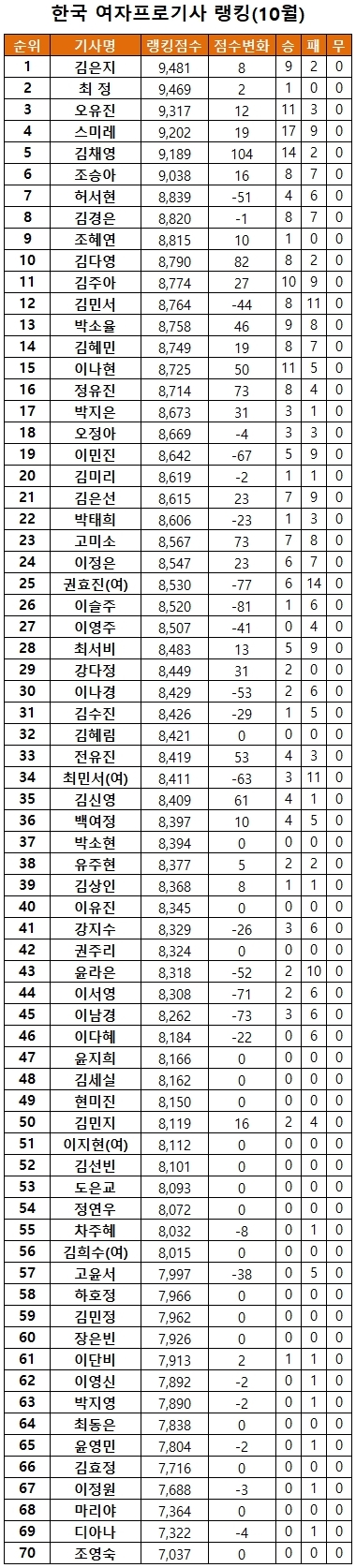 ¿©ÀÚ·©Å·¿¡¼´Â ±èÀºÁö 9´ÜÀÌ 3°³¿ù ¿¬¼Ó 1À§¸¦ À¯ÁöÇß´Ù. ±èÀºÁö 9´ÜÀº Á¾ÇÕ·©Å· 31À§(9481Á¡)¸¦ ±â·ÏÇϸç ÃÖÁ¤ 9´Ü(33À§¤ý9469Á¡)À» ±Ù¼ÒÇÑ Â÷ÀÌ·Î ¾Õ¼¹´Ù.