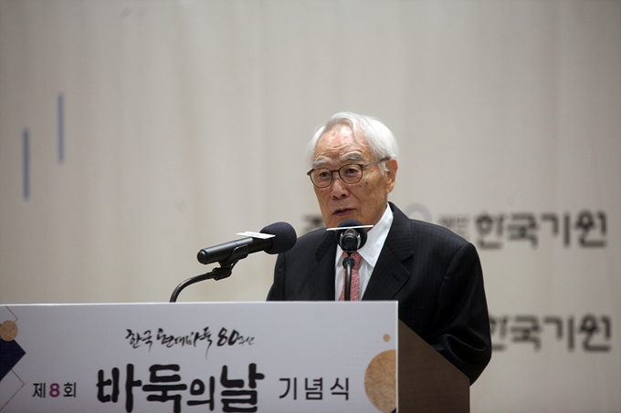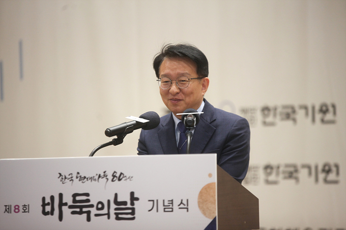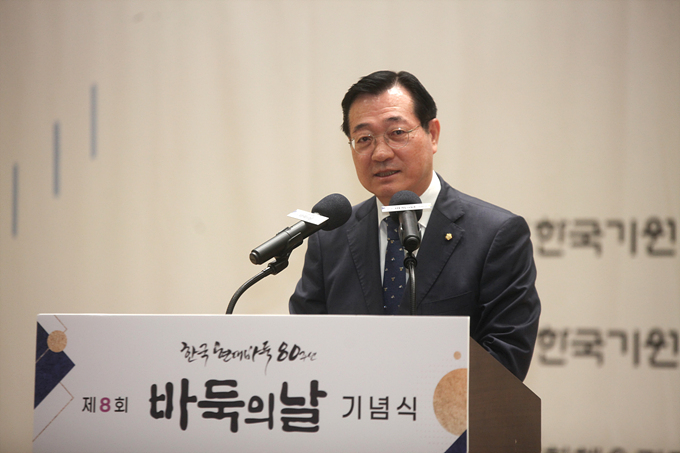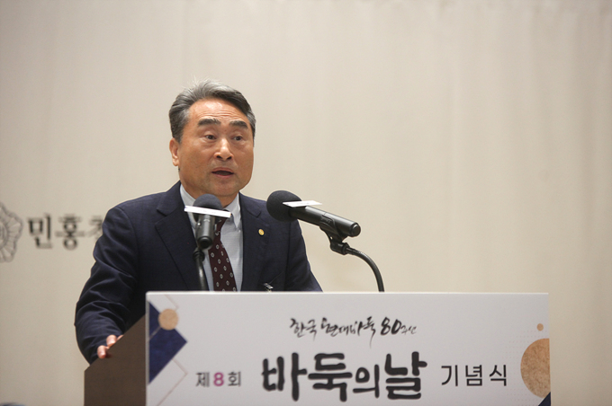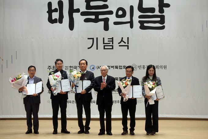 ¡ã ÇϱÙÀ² ´ëÇѹٵÏÇùȸ ȸÀåÀº ¡°Á¦8ȸ ¹ÙµÏÀÇ ³¯À» ¸ÂÀÌÇÏ°Ô µÈ °ÍÀ» ¸Å¿ì ±â»Ú°Ô »ý°¢ÇÑ´Ù. ¹ÙµÏÀÇ ¹Ì·¡´Â ¿ì¸® ¸ðµÎÀÇ ¼Õ¿¡ ´Þ·Á ÀÖ´Ù. ±â»ç¡¤ÁöµµÀÚ¡¤ÆÒ ¸ðµÎ°¡ ÇÔ²² ¹ÙµÏ ¹®È¸¦ »ç¶ûÇÏ°í ¹ßÀü½Ãų ¶§ ¹ÙµÏÀº ¾ÕÀ¸·Îµµ ¿ì¸® ¹ÎÁ·À» ´ëÇ¥ÇÏ´Â ¹®È·Î °è¼Ó ³ª¾Æ°¥ °ÍÀÌ´Ù. ¿À´Ã ¹ÙµÏÀÇ ³¯ÀÌ ´Ü¼øÇÑ ±â³äÀÏÀÌ ¾Æ´Ï¶ó ¹ÙµÏÀÇ °¡Ä¡¸¦ ´Ù½Ã ÇÑ ¹ø »ý°¢ÇÏ°í ¹ÙµÏ ¹ßÀüÀ» À§ÇØ ³ª¾Æ°¡´Â ÀüȯÁ¡ÀÌ µÇ±â¸¦ ¹Ù¶õ´Ù¡±°í ¸»Çß´Ù.