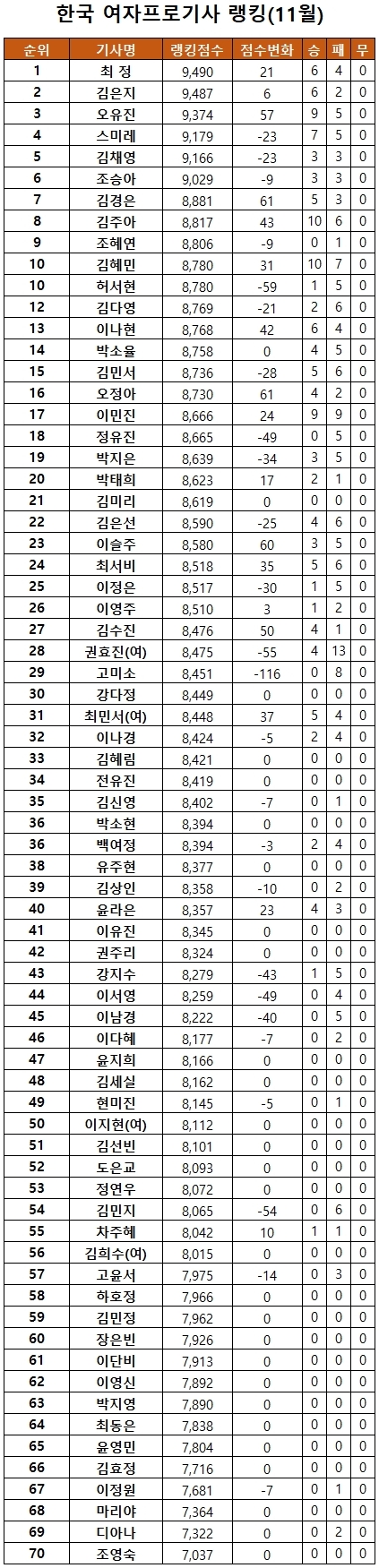 ½ÅÁø¼ 9´ÜÀÌ 11¿ù ·©Å·¿¡¼µµ 1À§¸¦ Â÷ÁöÇϸç 71°³¿ù ¿¬¼Ó ¿ÕÁ¸¦ ÁöÄ×´Ù.